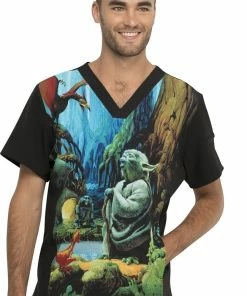 Show off your inner Jedi with the exciting Tooniforms by Cherokee Men’s Jedi Master I Am Print Scrub Top. This vivid, colorful print scrub top features Jedi master Yoda and R2D2, adventuring through the swamps!