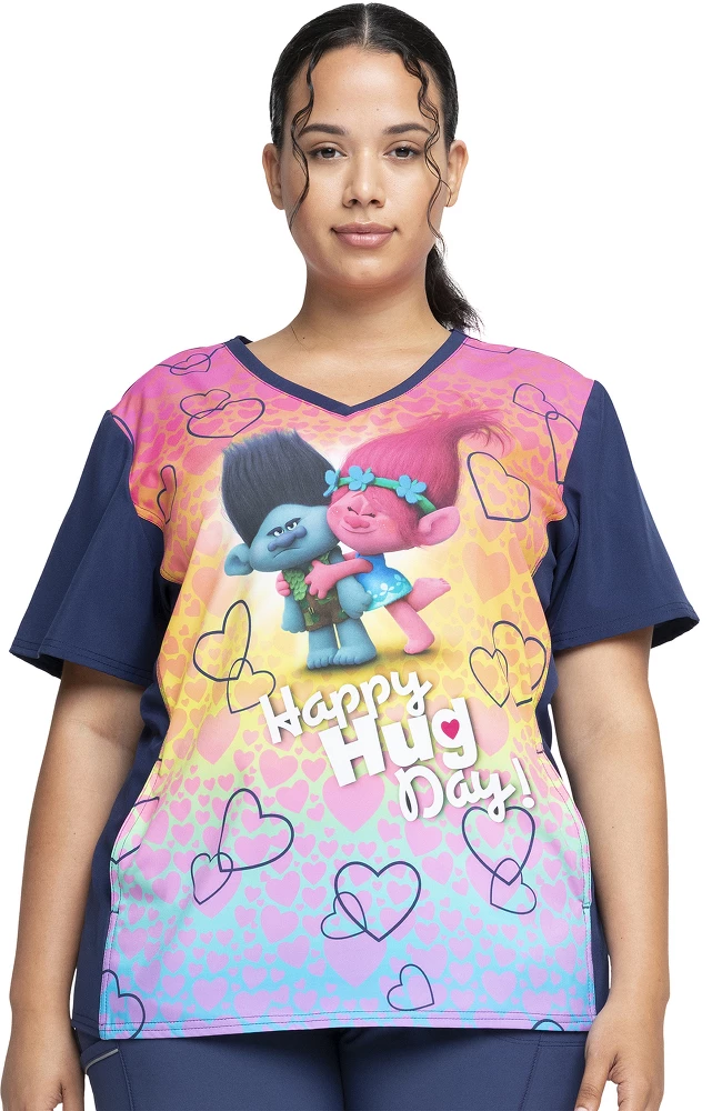 Embrace the day in the Tooniforms by Cherokee Women’s Happy Hug Day Print Scrub Top. This vibrant scrub top has a heart-filled digital print on a background of solid navy.