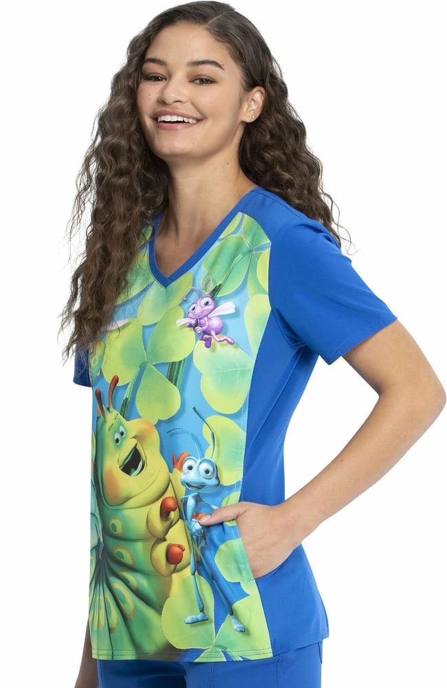 Share your love for the movie A Bug’s Life in the classic Tooniforms by Cherokee Women’s Heimlich Maneuver Print Scrub Top. This unique print features all of your favorite characters, including Flick, Dot, Princess Atta and Heimlich.