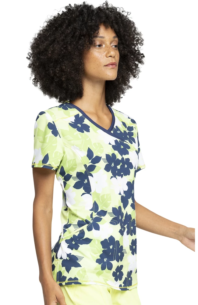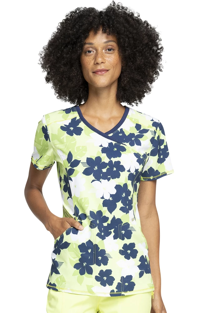 Freshen up your workwear with the bright lime shades on the Infinity by Cherokee Women’s Mock Wrap Tropic Shadow Print Scrub Top. The unique neckline adds extra flair to this fun floral scrub top.