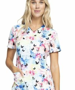 Butterfly lovers will adore the Infinity by Cherokee Women’s Rainbow Flight Print Scrub Top. The watercolor tie-dye background gives you so many options for mixing and matching.