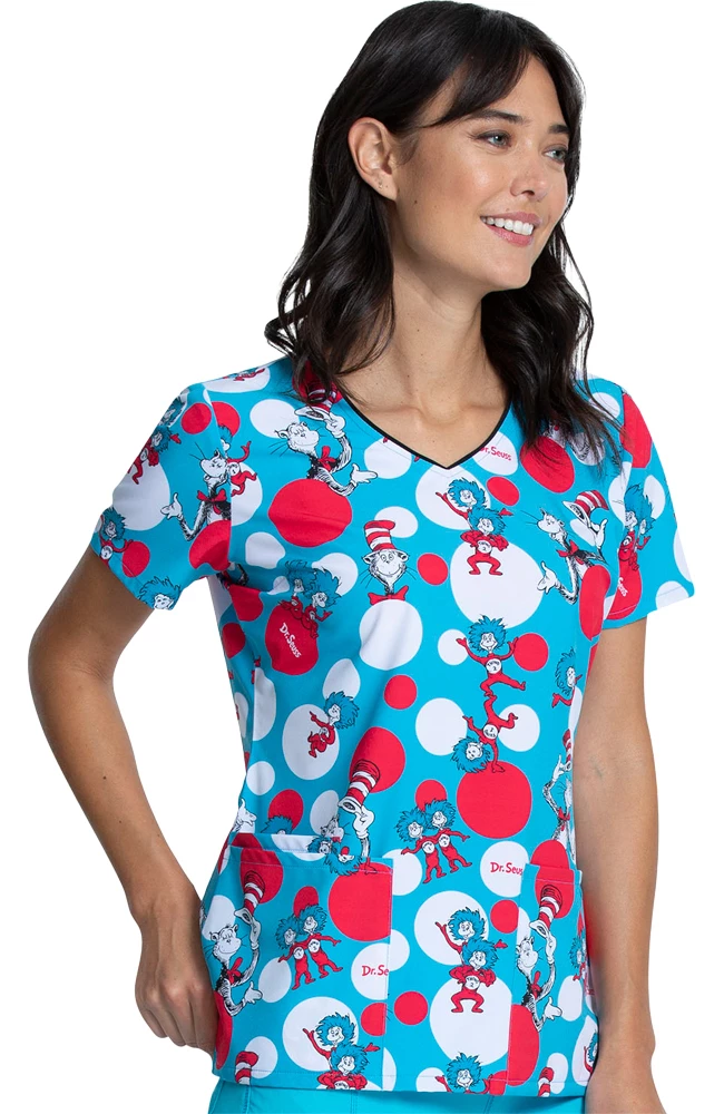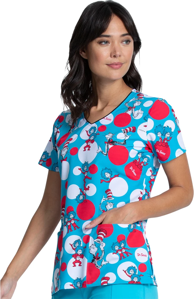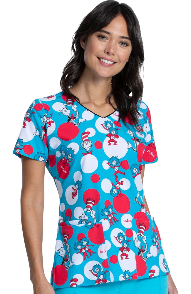 Show your true colors in the Tooniforms by Cherokee Women’s Spotting Trouble Print Scrub Top, which features your favorite Dr. Seuss characters. This fun, colorful print scrub top is ideal for pediatric settings.