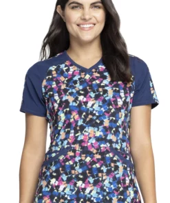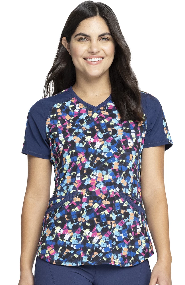 Rib knit panels add a sporty touch to the Infinity by Cherokee Women’s Tech Texture Print Scrub Top. The colorful print makes this scrub top easy to mix and match.