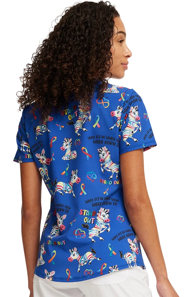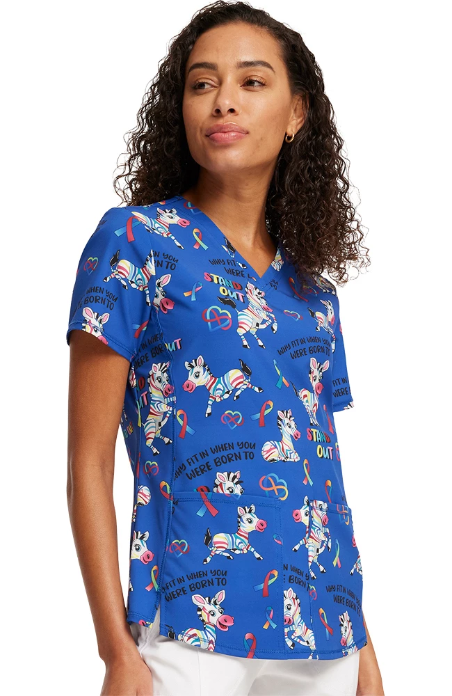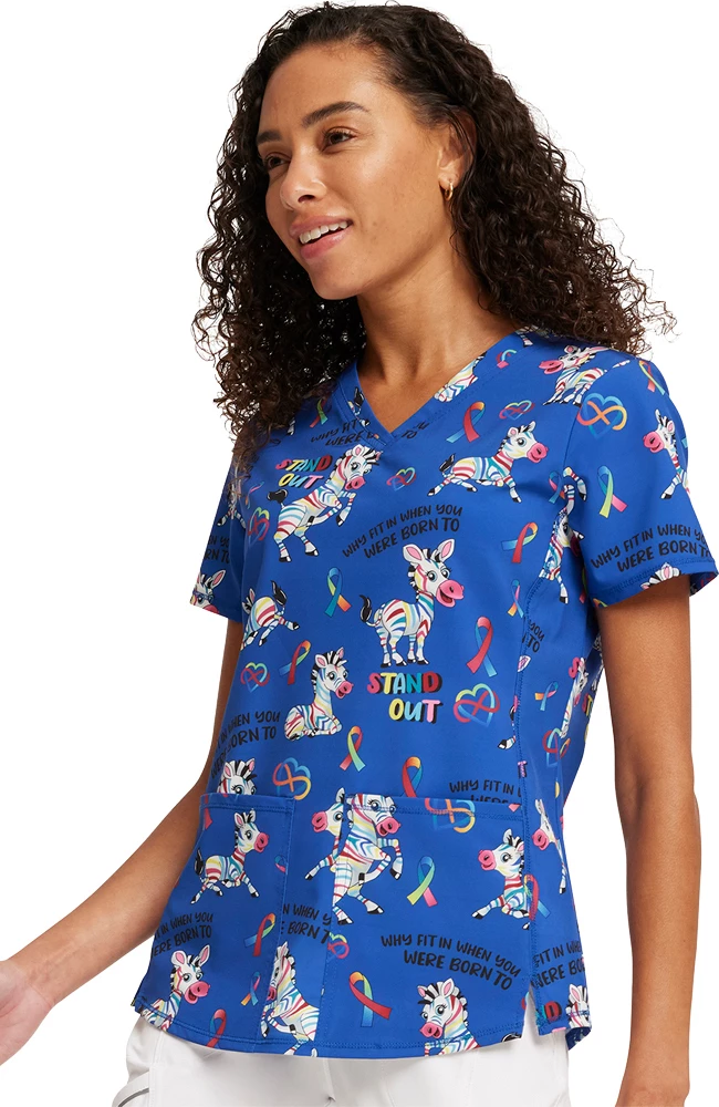 Designed to get you noticed, the Fashion Prints by Cherokee Women’s Born To Stand Out Print Scrub Top adds a fun twist to your everyday professional look. This eye-catching scrub top features a feminine silhouette and pockets for all your needs.