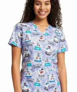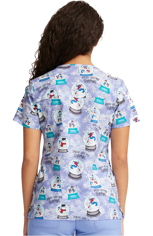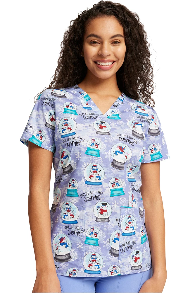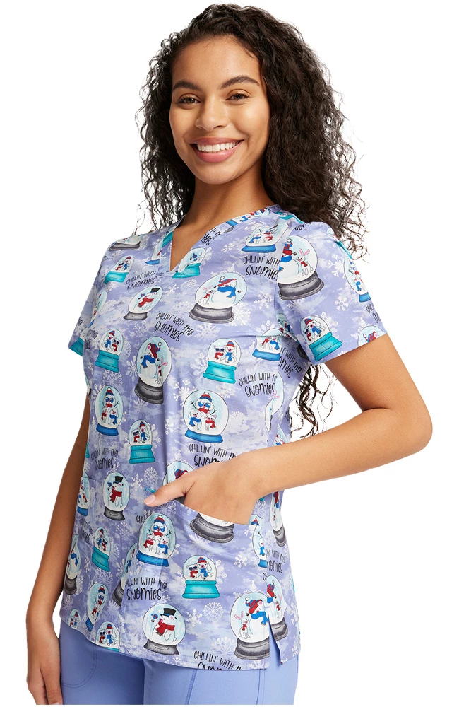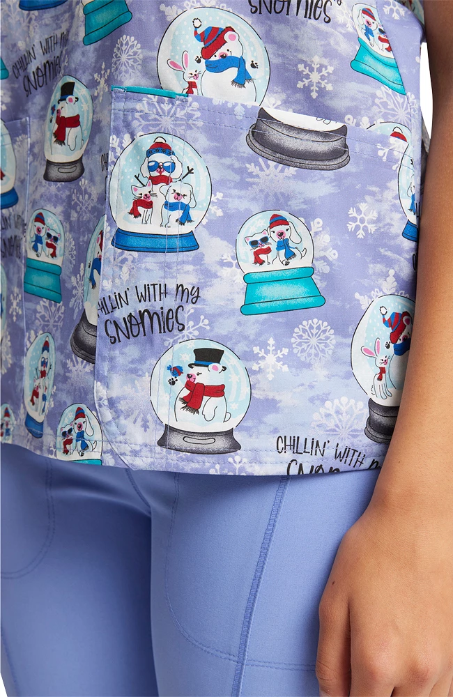 Snowflakes, snowmen, snowglobes! Holiday favorites abound in the Fashion Prints by Cherokee Women’s Chillin’ Snowmies Print Scrub Top. With three handy pockets, it’s as functional as it is fun to wear, all season long.