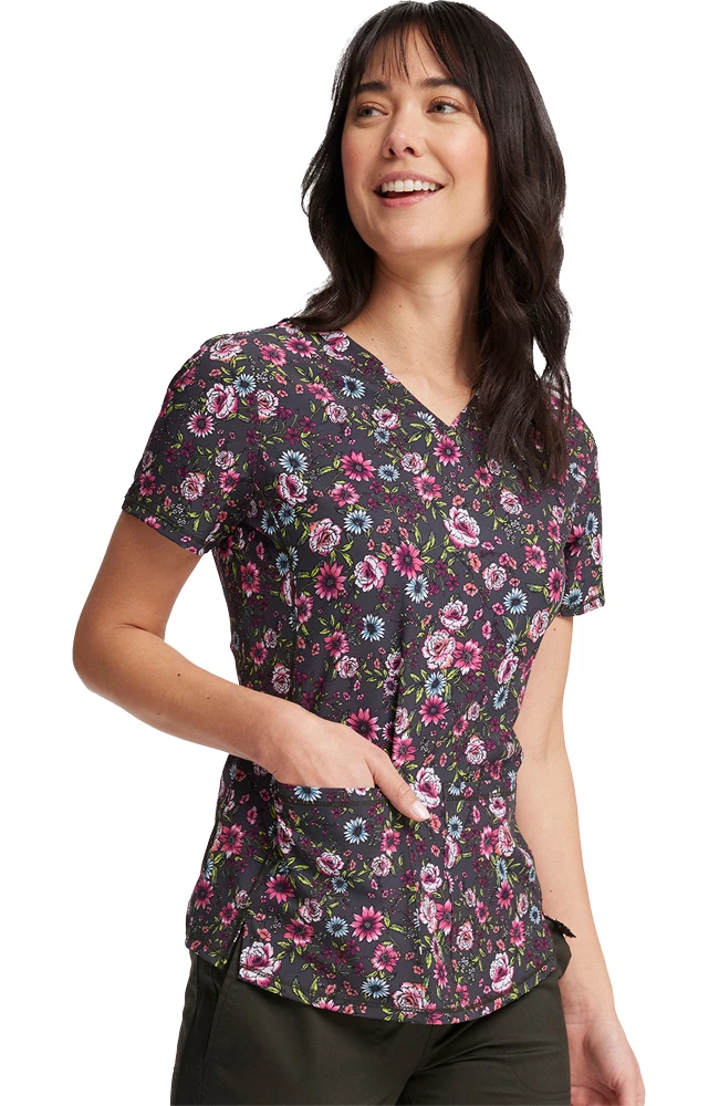 The season’s dark florals add a chic, moody vibe to the Fashion Prints by Cherokee Women’s Romantic Garden Print Scrub Top. Princess seams ensure a flattering silhouette, while two roomy pockets give you space for your essentials.