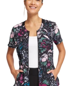 Dark, moody florals add a romantic vibe to the Infinity by Cherokee Women’s Zip-Front Wild Fleur You Print Scrub Top. This irresistibly unique top has a full zip-front closure, plus two front pockets for your must haves.