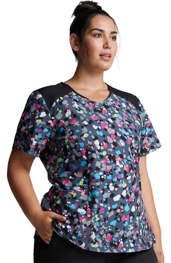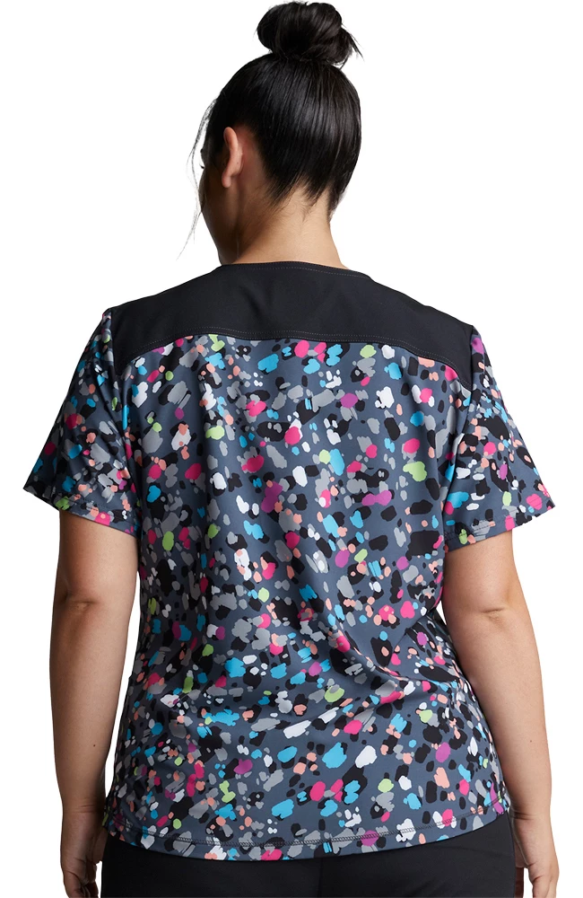 Spread joy and positivity in the Dynamix by Dickies Women’s Confetti Pop Print Scrub Top. This colorful scrub top has two roomy patch pockets, plus contrast panels for added style.