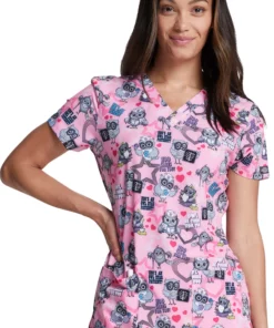 A wise choice indeed for pediatric settings, the EDS Signature by Dickies Women’s Hoo Cares For You Print Scrub Top features an sweet owl, heart and star design. The text says “Owl Be There For You”, “Hoo’s An Owl Star Patient?” and “Hoo Cares For You?”.