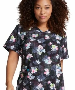 Vibrant florals add chic contrast to the Dynamix by Dickies Women’s Light Bright Blooms Print Scrub Top. The textured black grid background gives this unique scrub top its modern edge.