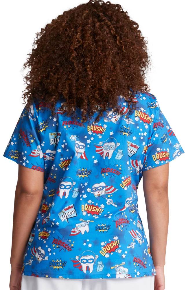 Encourage healthy habits when you wear the EDS Essentials by Dickies Women’s Super Smile Print Scrub Top. This toothy superhero-inspired scrub top is sure to be a hit at dental offices.