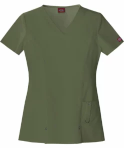 A perfect shape and unique details make this a very desirable scrub top. This V-neck scrub top features front print strapping and decorative logo eyelet accents just above the vents. Back princess seams provide additional shaping. There also front patch pockets and a cell phone pocket that has a self tab with a utility “D” ring. The fabric is a poly/rayon/spandex blend for easy movement all day long.