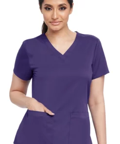 This Missy relaxed fit V-neck scrub top from Grey’s Anatomy Classic has an extra shirring detail at the back yoke and shoulders. It comes in fun, fresh, solid colors. The front patch pockets have a pen stitch and the sleeves are set-in. The fabric is a comfortable, wash and wear poly / rayon.