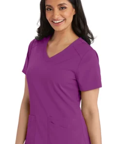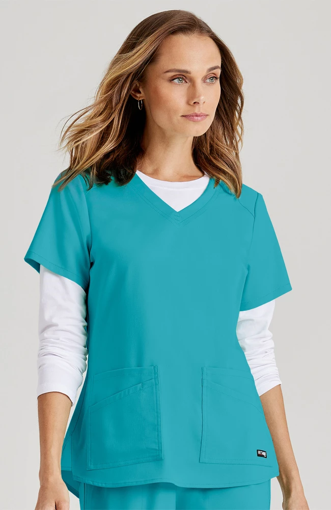 Find your happy place with the breathable, easy-fitting Spandex Stretch by Grey’s Anatomy Women’s V-Neck Solid Scrub Top. The curved shirttail hemline makes this scrub top look great tucked in or out, along with the symmetrical mirrored front pocket design.
