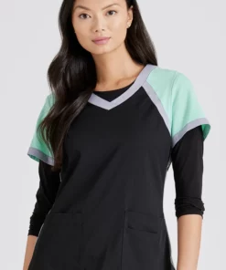 Get a modern color-blocked look with the Grey’s Anatomy Classic Women’s Tri-Color V-Neck Solid Scrub Top. This style is the perfect way to get a pop of color without wearing a print.