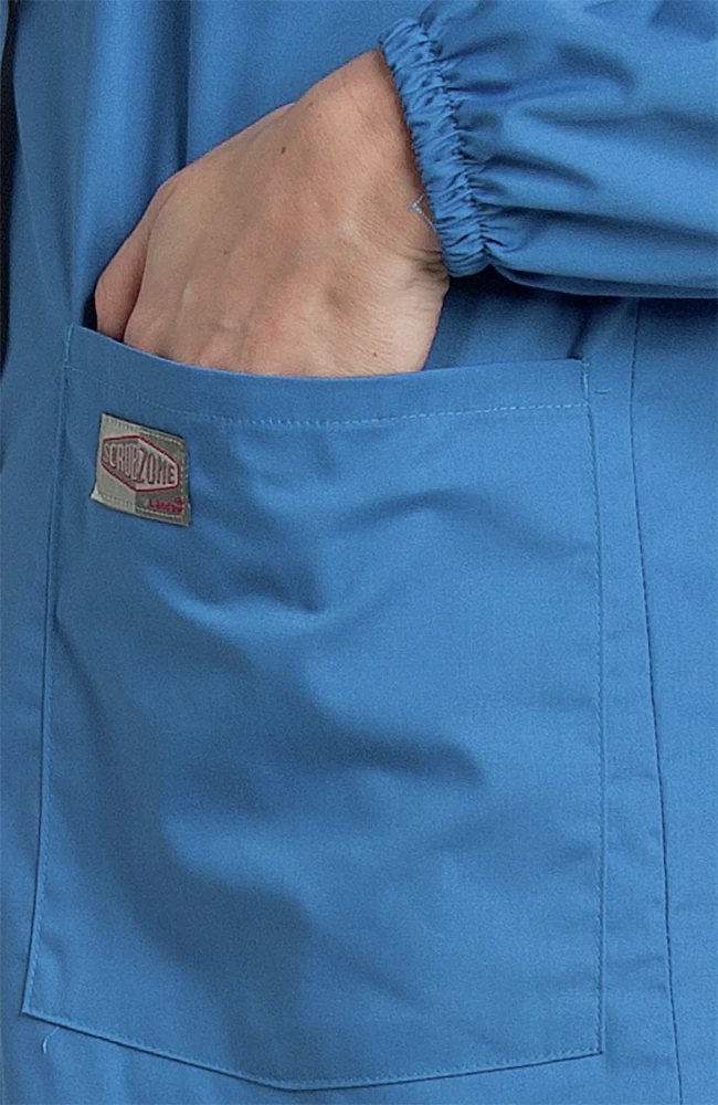 Scrub Zone scrubs work tough, fit comfortably and offer extraordinary value. This jewel-neck scrub jacket has four matching snap-ring closures and elastic covered cuffs. It features two large patch pockets. Hidden accessory tape inside right pocket holds instruments safely in place and maximizes storage. Cell phone division inside right pocket.