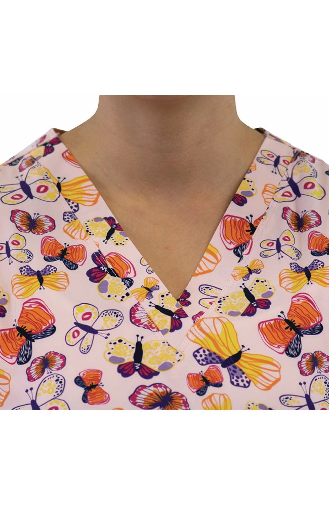 Float through your day in the Maevn Uniforms Women’s Candy Of Butterfly Print Scrub Top. Soft and comfortable, this scrub top has three pockets to keep your gear handy.
