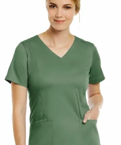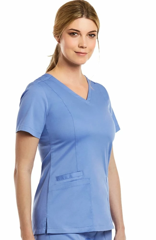 Add a little edge to your look with this Matrix by Maevn Women’s Double V-Neck Solid Scrub Top. A traditional neckline in front is mirrored with a smaller v-neckline at the back.