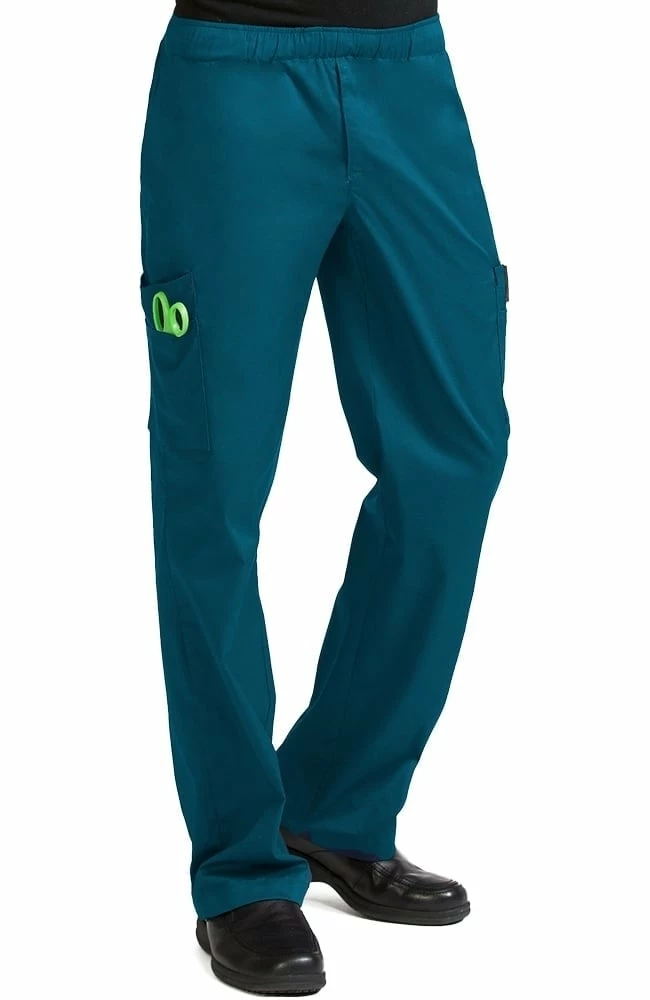 In a comfortable stretch twill, the 8702 elastic waist scrub pant from Med X is cut to be slimming and flattering. It has a roomy straight leg pant. The full elastic waist has a drawstring to adjust for a perfect fit and a functional fly zipper. There are double cargo pocket on each leg as well as side seam pockets and a back patch pocket.