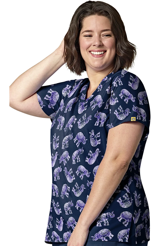 Switch up your work wardrobe with the WonderWink Women’s Enchanted Elephants Print Scrub Top. It has all of the functional details you expect, including patch pockets and a utility loop.