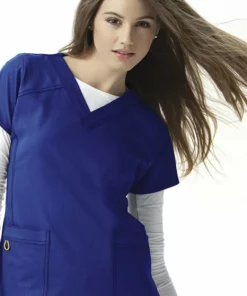This sport V-neck from WonderWink is made of durable four-way stretch polyester fabric. It has shaping panels at the waist and sides, along with an angled yoke at the shoulders. Its tagless neck has a stylized back yoke with locker loop and WonderWink logo. With two front pockets, secret mesh pocket-in-pocket, and utility loop.