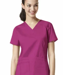 The “Verity” is a comfortable V-neck scrub top in premium quality stretch fabric. It will move with you and flatter your shape. This is accentuated by the 2 front darts. The 2 front patch pockets are slightly angled and the right pocket is layered with a second, divided pocket. There’s a dropped shoulder reinforced with triple-needle stitching. Contrast fabric at the back neck facing creates a flush seamline that lies flat. WonderFLEX is a cotton-rich, premium fabric. It has enough give to be supremely comfortable while maintaining its shape for a polished look.