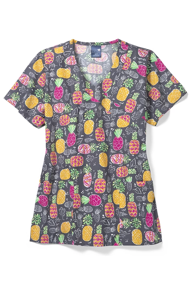 Feel the tropical vibes when you wear the pineapple-filled Zoe and Chloe Women’s Mock Wrap Aloha Summer Print Scrub Top. The mock wrap neckline adds an especially flattering touch to this colorful scrub top.